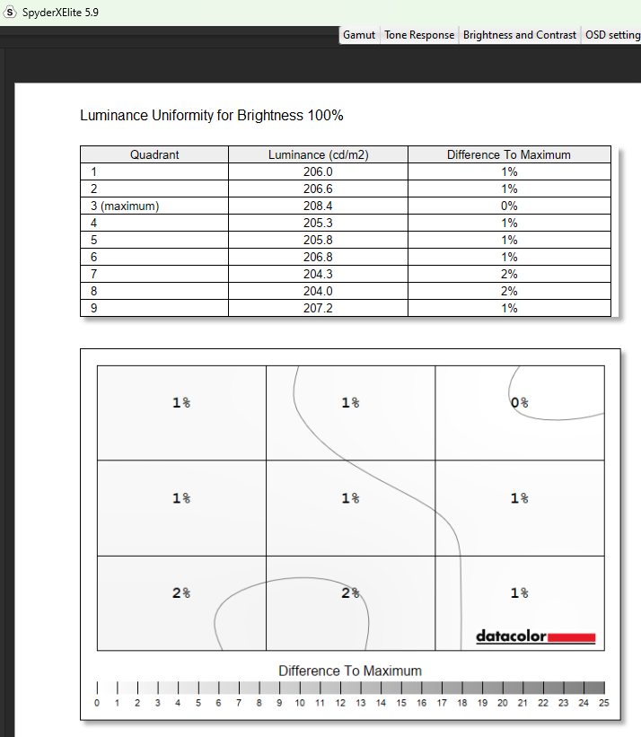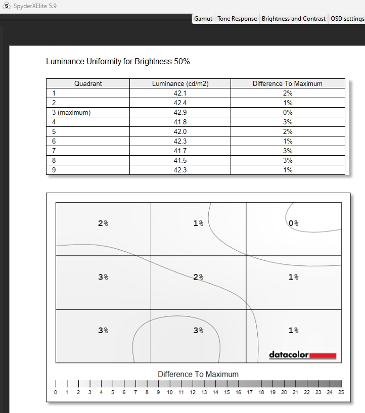 With the colour uniformity of this particular panel though, there was a slight issue with the centre at 50% brightness, and when I say slight I mean extremely slight, with a hotspot appearing though at 100% brightness, the results were pretty much on par, with the centre being unaffected with the increase in brightness, but the edges getting slightly inaccurate, but again, by no means is this really an issue. And then the same with luminance uniformity performing superbly with a slight offset of 3% towards the bottom right-hand corners at 50% brightness. at 100% brightness it was all good.