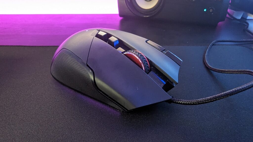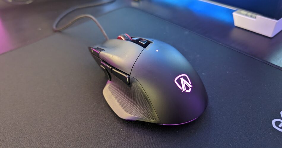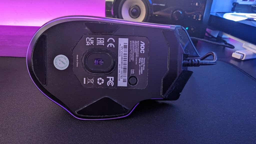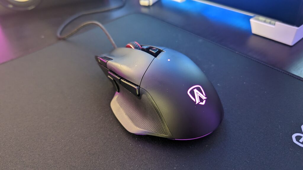 The mouse is covered in a nice soft-to-touch material, there’s no rubber down the sides and unfortunately, it can be a bit of a fingerprint magnet on the left and right clicks. The sides of the AGM600 do have a rough texture pattern though which does work for grip. I had no issue with swishing the mouse around my mouse pad. At 146 grams, it’s not the lightest mouse on the market, and remember the G502X came in at 102 grams. But you’ve got to remember, this is a wired mouse, so a chunk of that weight is being taken up by the braided cable. It isn’t a huge difference though while in use if comparing both mice only, and the comfiness of this mouse in my hand while using my go-to palm grip. It’s nicely domed towards the rear, which aids with a palm grip so I can rest my entire hand over the mouse, though the shape does lend itself to a palm grip too if that is your go to way of holding a mouse. There’s a thin RGB strip that runs around the base of the mouse, which isn’t the brightest, and then the logo on the back does light up too. There’s a small pin light just under the DPI switch that’ll give you an idea on which sensitivity you’re using on the mouse, though once your hand is covering it, you’re not going to see it.