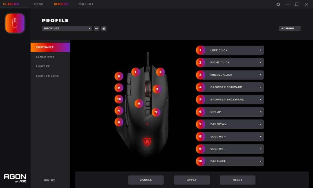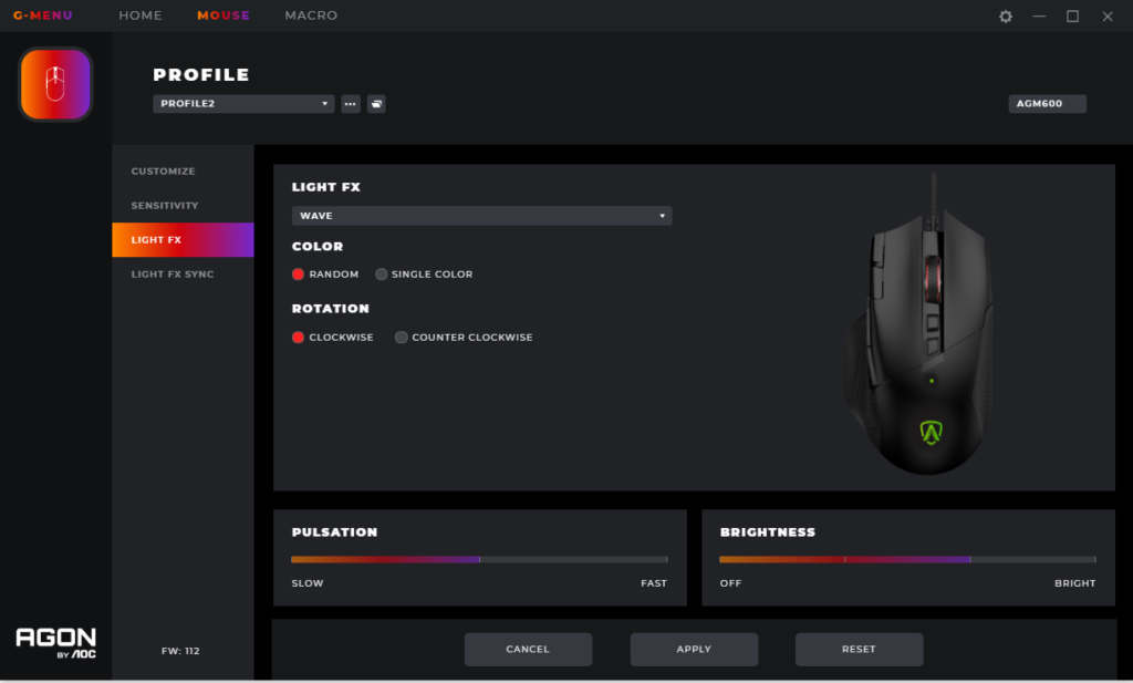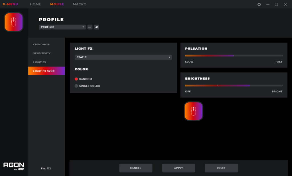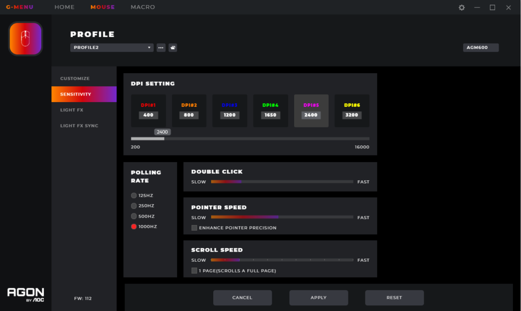 The driver needed on your PC for the mouse is called the G-Menu. And again, the comparison to Logitech’s software is uncanny, called the G-Hub by the way. The G-Menu software is laid out pretty well and I had no issues finding the settings I needed to change to suit me. The first screen will allow users to change the functionality of their mouse clicks. Screen two is for adjusting your DPI sensitivity levels which run up to 16,000 DPI, of which there are five different modes. You cannot seem to change the colours here, and you cannot remove any of the sensitivity levels, so you’re stuck with five levels. There’s a setting for your polling rate, which can hit up to 1000Hz, and things like scroll speed and double click speed. Screen three is for your RGB effects of which there are really only very few, and these consist of things like static lighting, a breathing effect a flash, and the like. These can be set to random colours or a single static colour and screen four is for your Light FX sync settings if you’re using other AOC products.
