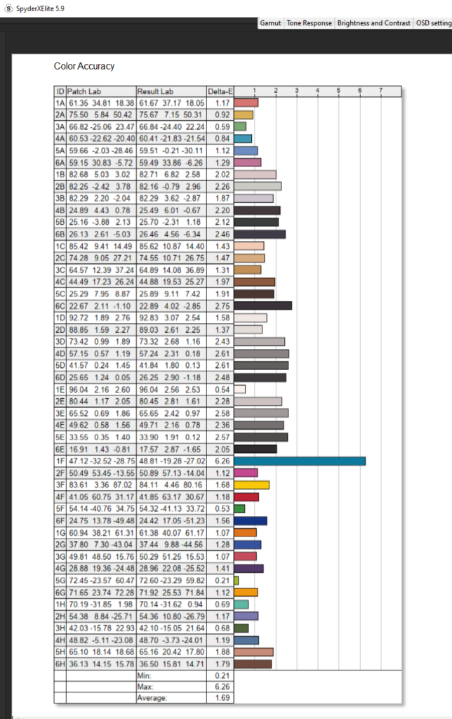 Colour accuracy though on this AOC panel was superb, coming in with an average of 1.69 Delta-E pre-calibration with a high of 6.26 and a low of 0.21. However, the high score was only achieved by a single blue colour which threw off the average somewhat, but still a great score overall. This only got better with a calibration where I saw the average Delta-E score drop to 0.89. So a small improvement but a welcome one. I decided to keep the monitor in the sRGB mode for the remainder of my testing, as this provided the best results for me and my usage with games and workflow on things like Premiere Pro for video editing. All scores can be found below in the gallery.