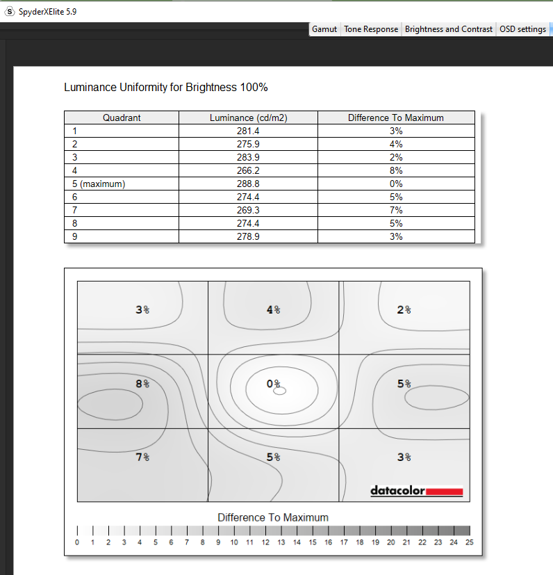 Colour uniformity at 100% brightness didn’t perform too badly, but I did see a hotspot in the top middle and a darker spot towards the bottom corners. Overall though not too bad. And when I went down to 50% brightness things improved somewhat but we still saw the top middle perform the worst. Luminance uniformity again fell down and at 100% brightness, the biggest difference was down the left-hand side, but at 50% brightness things got way worse on that left.