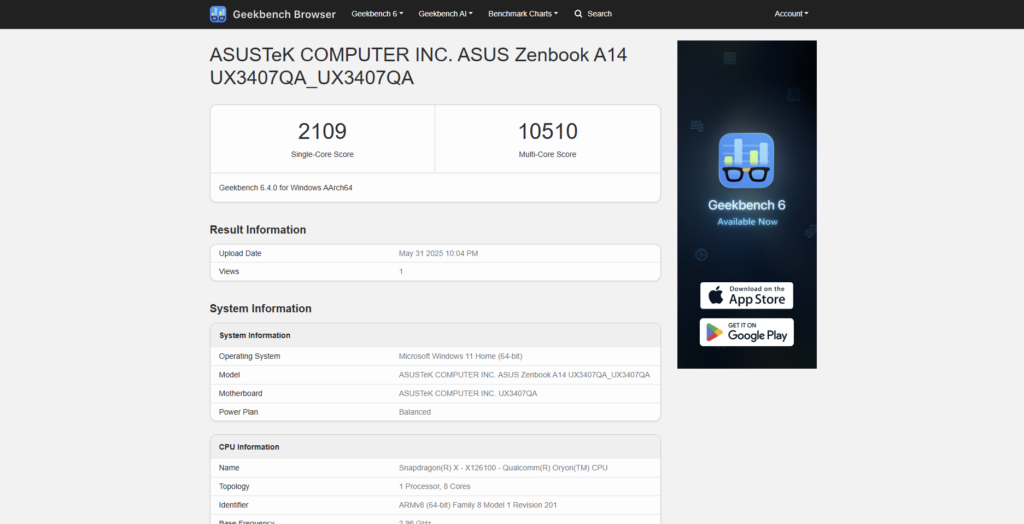 So, under the hood, this Zenbook A14 is powered by a Qualcomm Snapdragon X126100 according to the laptop’s spec, and 16GB RAM, though you can have up to 32GB RAM if needed. In terms of graphics processing it uses a Qualcomm Adreno X1-45 GPU, which to be perfectly honest with you, I know nothing about except that Qualcomm usually produce mobile phone hardware. Running a Geekbench 6 test saw a single core score of 2,109 and a multicore score of 10,510 so take that as you will, but I tried searching for compatible scores, and it kept giving me different results of these Asus Zenbooks, so I couldn’t give you much of a comparison of what you could have instead. But still, no heavy duty video editing here, because when I did try, and I use Davinci Resolve now to edit my videos, it was just a horrible stuttery mess of a time. Though I must say that the laptop didn’t feel like it got too hot when it was on my lap, and then there feels like there’s no fans either which means it runs pretty silent.