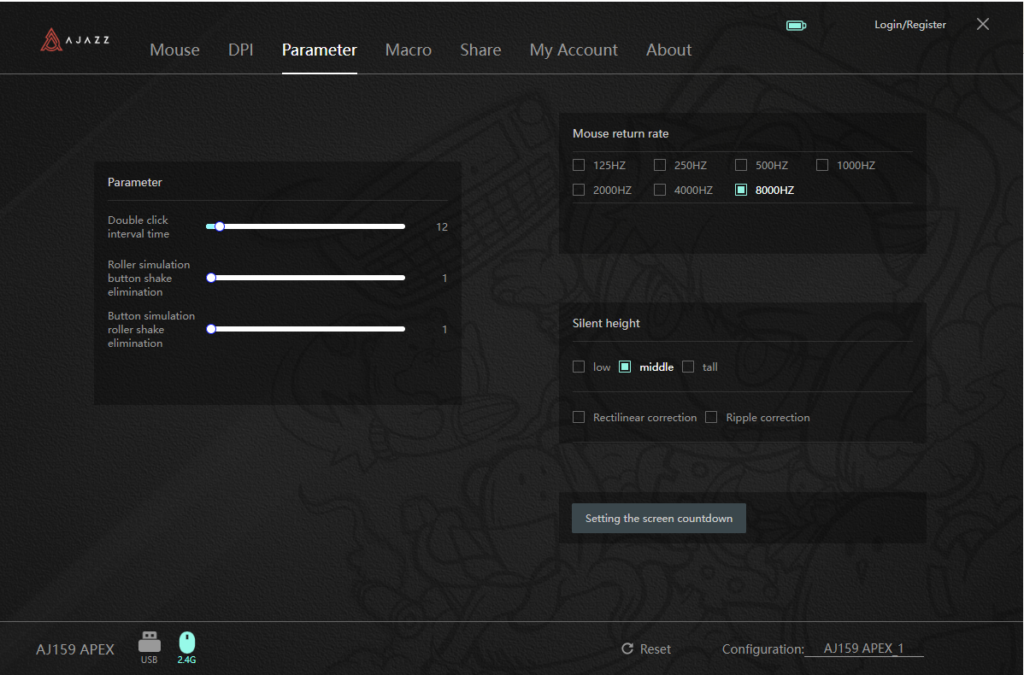 Settings here won’t look too dissimilar to what gamers are used to, with the options to change functions of different buttons, you’ve got your DPI changer which can be customised to different sensitivities, your parameter settings which include things like your double click interval time, roller simulation button shake elemination and button simulation roller shake elimination, all of which sound like they might be super useful to proper gamers, but filthy casuals like me didn’t really touch them. I did however set my return rate to 8,000Hz which is huge. Finally you’ve got some macro settings, your share settings and some account settings if you have an account with Attack Shark. The charging dock also comes with some settings for the screen where you can have a clock, a single image or an animation that flicks between photos you upload with a minimum speed of 255ms, which is extremely fast to even take note of the images on the slide show. Bit rubbish really.