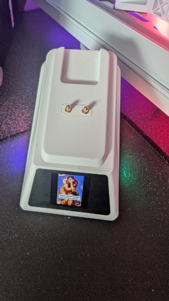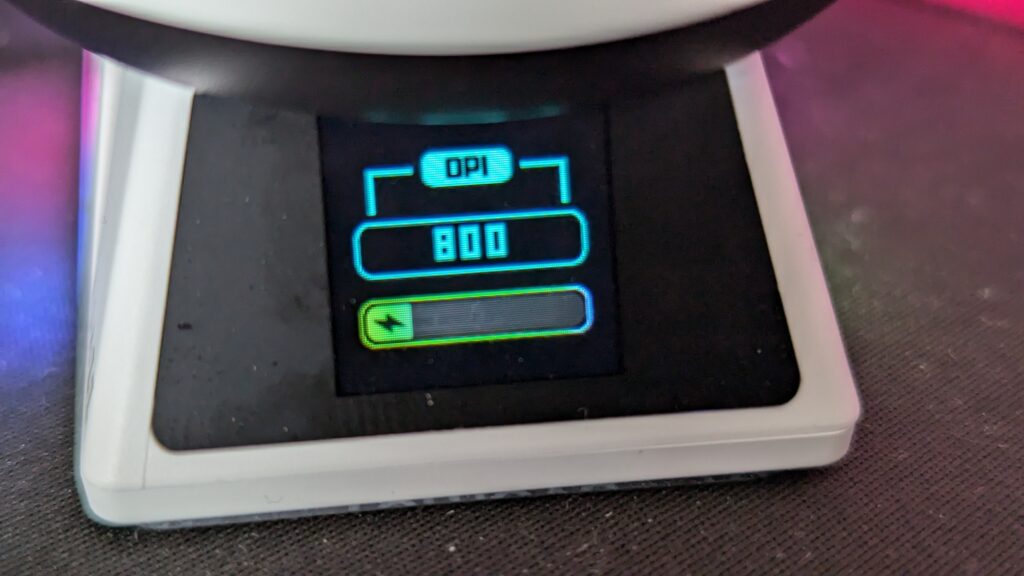 So let’s talk quickly about the dock because it’s unique in the fact it has a little screen on the front to show important information like your battery life or your DPI setting, but you can also upload images to it, which is obviously so much cooler than the mouse telling it’s using a 2.4GHz connection. You can either have a static image or a very fast-moving slide slow, which the slowest interval between images you can have is 244 milliseconds which is super rough and nowhere near enough time to actually look at your images. The dock is magnetic, so the mouse just sits in place quite nicely and is suspended at an angle. Makes for quite a nice piece on the desk actually. Very tidy indeed.