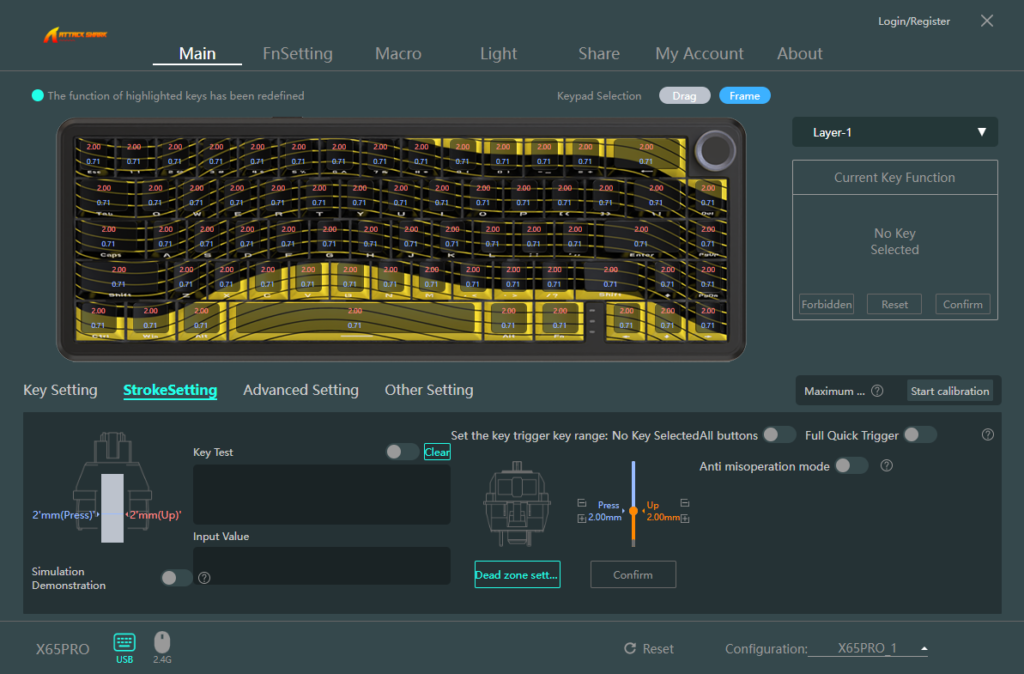 Now the X65PRO HE uses Attack Shark’s own magnetic switch. There’s no fancy name for it, it’s just called the Attack Shark Magnetic Switch and it has a total travel distance between 3.5mm and 0.2mm which is crazy and requires an operational force of between 30 and 10 gram force which is really not much and I must say that the effort to actually get an action out of this keyboard takes very little effort. And even more so if you use the Web Driver to adjust the operational height of the keys. This is where the Web Driver comes in because you’ll have to ability to adjust the Stroke Setting of each key or the keyboard as a whole. This means you can set your activation points within each key and can go down to as little 0.01mm travel distance from the point pressed, which is where the Rapid Trigger technology comes in.
