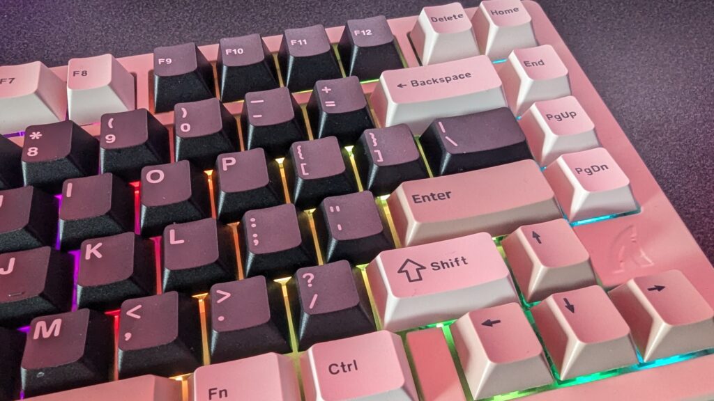 Okay now that’s out the way, what do you get? the X75 uses Double Shot PBT keycaps which feel nice and smooth albeit a little thin to the touch. These are connected to Kalih MX Switches which feel nice and flexible and do not really need much force to type, and key actuation feels really solid. They are completely hot-swappable though if you have your own switches you want to bring along to the party. The Kailth Switches here feel like you get an action about four-fifths of the way down a press which is definitely okay with me. These switches are mounted on a PCB-Gasket Mount with 14 dampening buds, and different types of foam to produce that sound dampening and several layers including PORON layers, PET sound-absorbing layers, EPDM bottom foam and PET Insulation cotton. I must say these keys do feel nice and clicky and have a pleasing aesthetic. Not quite that of the AULA F75 we took a look at not too long ago, but decent enough. I’m not disappointed with this keyboard and its sound profile put it that way,