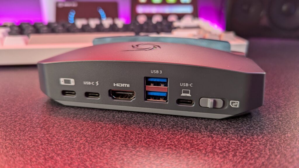 Across from that is for passing through power. So for example, my Steam Deck power supply is plugged into this port, and power is capped at 65 watts which isn’t too bad, and can easily keep a Steam Deck powered while in use. The final USB Type-C port is designed to run to your handheld or tablet, which is what I’ve got plugged into my Steam Deck and a small Type-C to Type-C cable is included. Please note at this point that there is no power adapter in the box, so you will need to rely on an external power supply from your handheld or tablet. There’s a USB Type-C to Type-A cable included to connect it to your PC, and the length is actually pretty generous and could stretch the length of my desk to my desktop with ease.