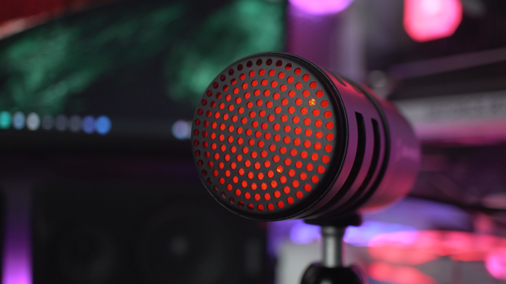 Around the back, you can find a big mute button which once pressed, not only turns the light around the back to red, but also turns off the red LED light inside of the grill at the front so you’ve got a better visual of if the microphone is on or not. You can also find a 3.5mm aux input your headphones so you can monitor your audio and voice at the same time, and finally a scroll wheel for volume. The microphone has a smooth texture to it and it’s quite lightweight coming in at 292 grams.