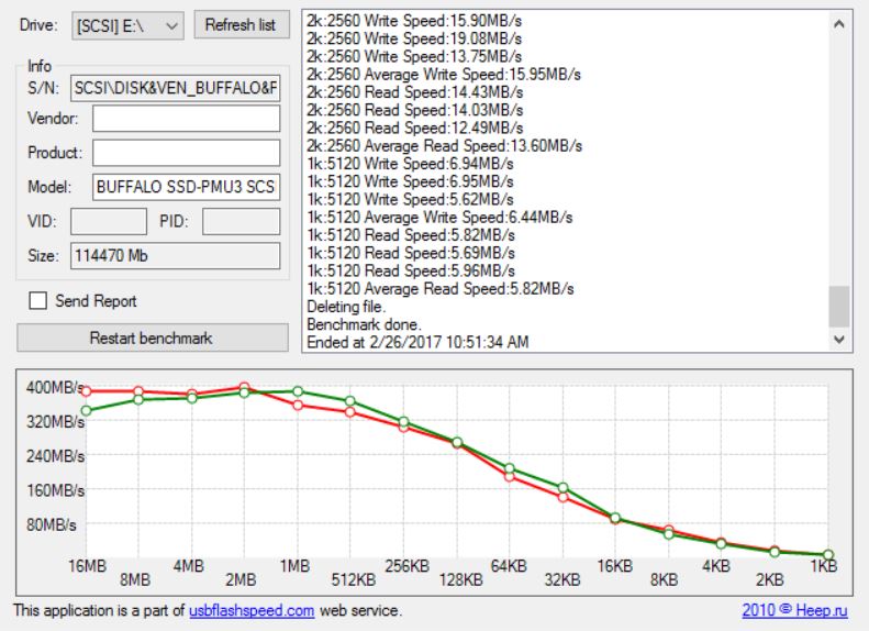 It claims that the drive can write at 370MB/s and has a read speed of 420MB/s which is pretty accurate. We ran a benchmark on the SSD drive and results were very similar to the ones claimed by Buffalo themselves. You can see our results below.