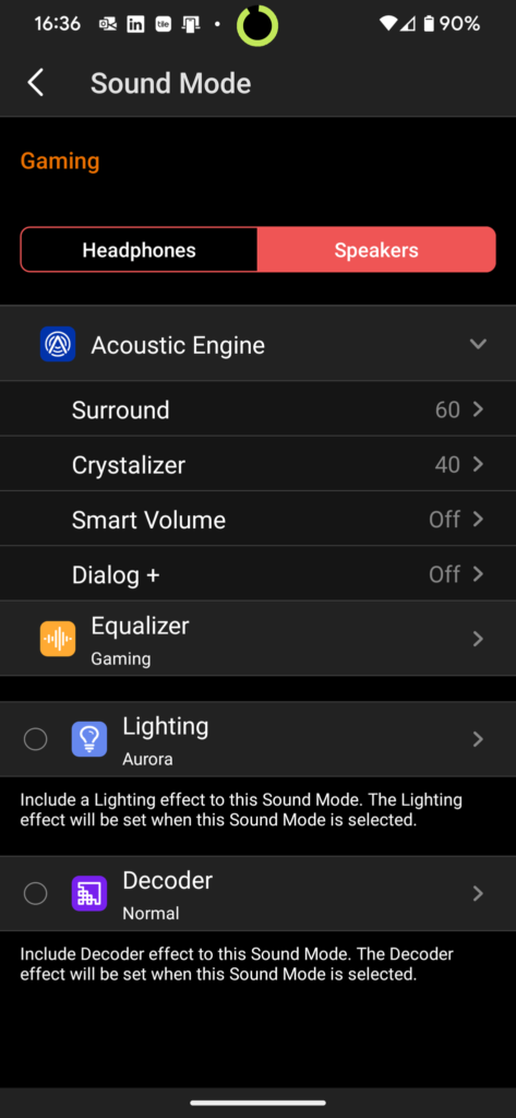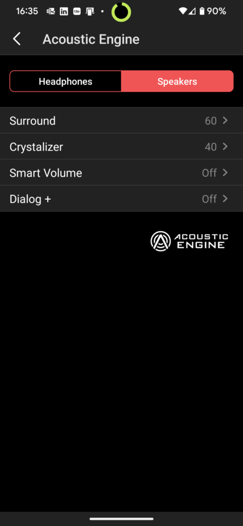 There is a partner app that you can use on either your PC or your phone to fine-tune some settings on the soundbar. Most notable is the chance to really customize your audio with a full equalizer. That is a great feature and one that shouldn’t be overlooked. The other audio-enhancing feature in the app is the Acoustic Engine, which allows you to customize your surround, includes a Crystaliser, and even a Dialogue+ button for enhanced voice audio. The Smart Volume feature does a great job of stabilizing your audio, so any sudden rise in volume in your audio is kept under control. It’s nice if you have neighbors or people in the house at night time.