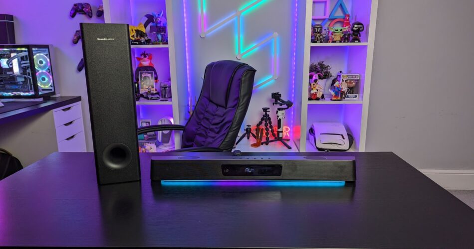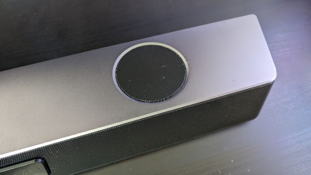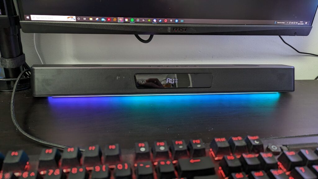 So, what’s included in the box? Well, you get the soundbar and subwoofer, an included remote control, some power plugs for different countries, its power adapter, and a few bits of correspondence. The soundbar itself sits at 23 inches at its widest, around three inches at its tallest and a three-inch depth. Note I said at its widest and tallest. It sits slanted, so the speakers are aimed at you, and widens towards the back of the soundbar. The body is made from plastic, though the grill at the front and sides are metal. There’s a nice brushed grey metal finish on top which gives it an aura of premium, though trust me, it is plastic. There are two 19mm tweeters aiming upwards, combined with two 63mm mid-range drivers firing directly outwards. This paired with the 133mm driver in the subwoofer make it a pretty beefy soundbar. There’s a strip of RGB across the bottom to give it that gamery feel which is subtle enough not to look garish and offputting, and if combined with the PC software, you can customize these lights like I’ve done with the purple, teal and blue effect running across the bottom to match my PC. There are also microphones built-in, which are known as dual built-in beamforming microphones which can be used when making calls on Zoom or Teams. The sound quality here is alright, nothing great, but will get you through a meeting.