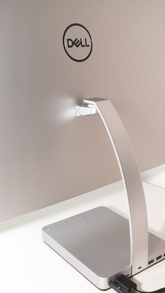 The Dell S2718D is mostly covered in a silver finish, with the tiny bezel of the screen as a shiny black surround. It’s extremely small and will take up little space on your desk. all of the connections can be found in the base of the monitor and include the power connector, HDMI port, USB Type C port, security lock slot, two USB downstream ports, and an audio line-out port. . The USB passthroughs an be used with laptops that take advantage of USB charging. The monitor itself is connected from the base using a thin metal arm. The arm can be twisted left and right, and can make the screen pan up and down for optimal viewing. There is no rotation to a portrait position.