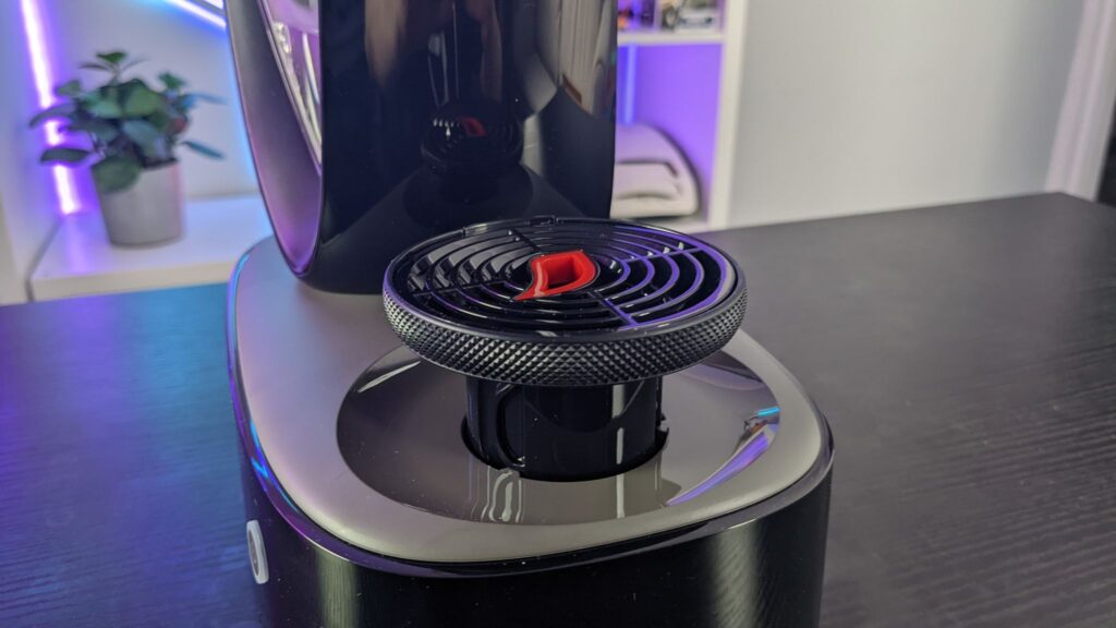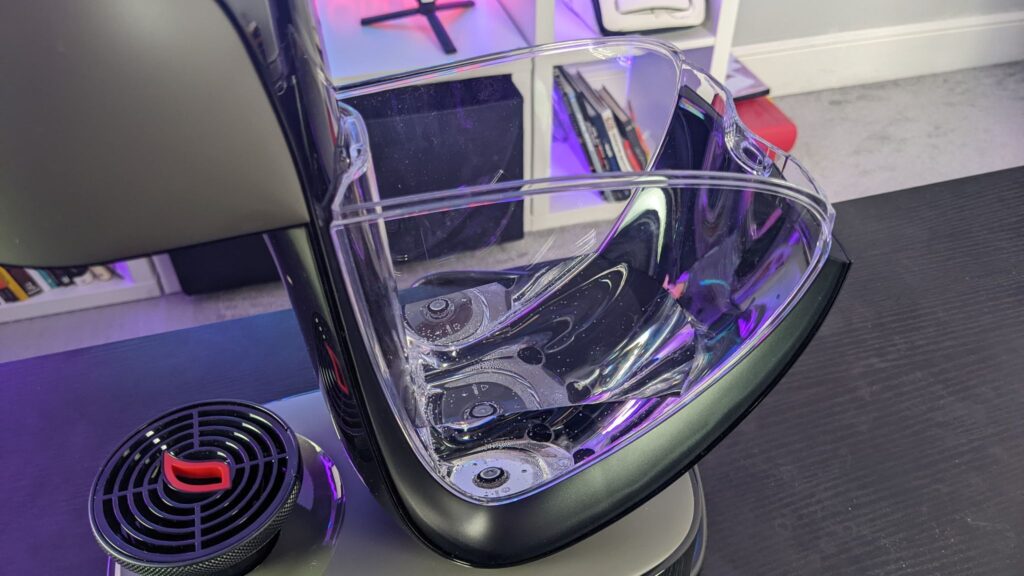 Dolce Gusto has moved away from that cylindrical style tank and moved to a very unique looking triangle shape, that meets at the bottom. That’s where the water is pumped through the machine. It’s rounded on the corners too, with no harsh edges in sight, which makes the machine look extremely elegant compared to those hulking coffee machines that cost hundreds if not thousands of pounds, and it’s definitely the best looking Dolce Gusto machine to date. The tank can hold around 1.2 litres of water and is capable of making around three to five coffees before it needs a refill. And refilling the tank is easy. Just remove the top lid, which just almost rests in place, and the tank can be removed to bring it to a tap. It also makes it easy for cleaning and drying too.