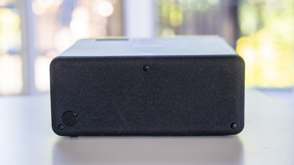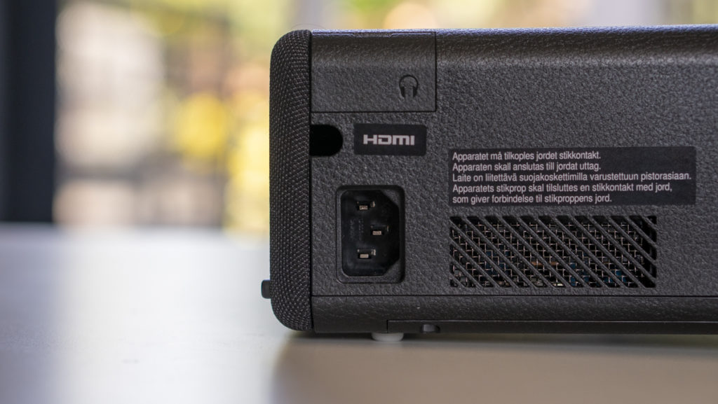 Making our way round the back, the rear panel which is covered in a soft to touch material. Why this is the case we’re not sure, but it will probably have something to do with airflow again as there are air vents on the back. Underneath the panel you can find a HDMI input and a USB input for power passthrough for an Amazon Fire Stick or Roku Express or similar. You can find a kettle plug input on the back left as you look at the projector.
