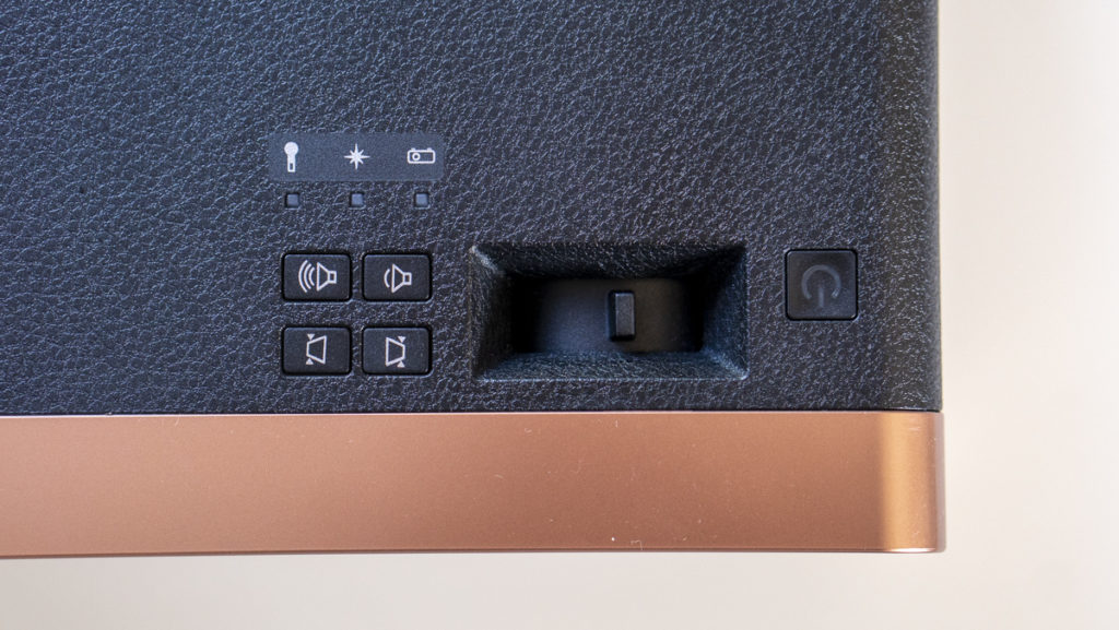 The Epson EF-100B portable projector comes in a very small package, measuring only 21cm wide, 9cm tall and 23cm in depth. It has a small opening on top right of the front for the lens and you can find all the buttons you will need on top including the focusing ring. The front is bordered in bronze plastic, giving it a nice premium finish, and the front panel acts like a grill for airflow. You will find several other grills and fans down the side of the device.