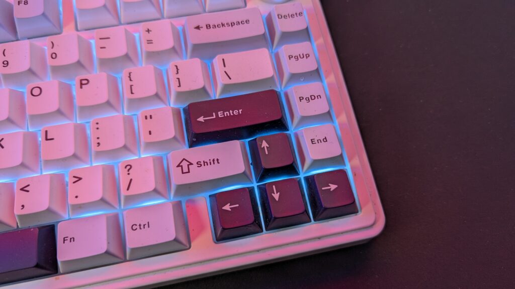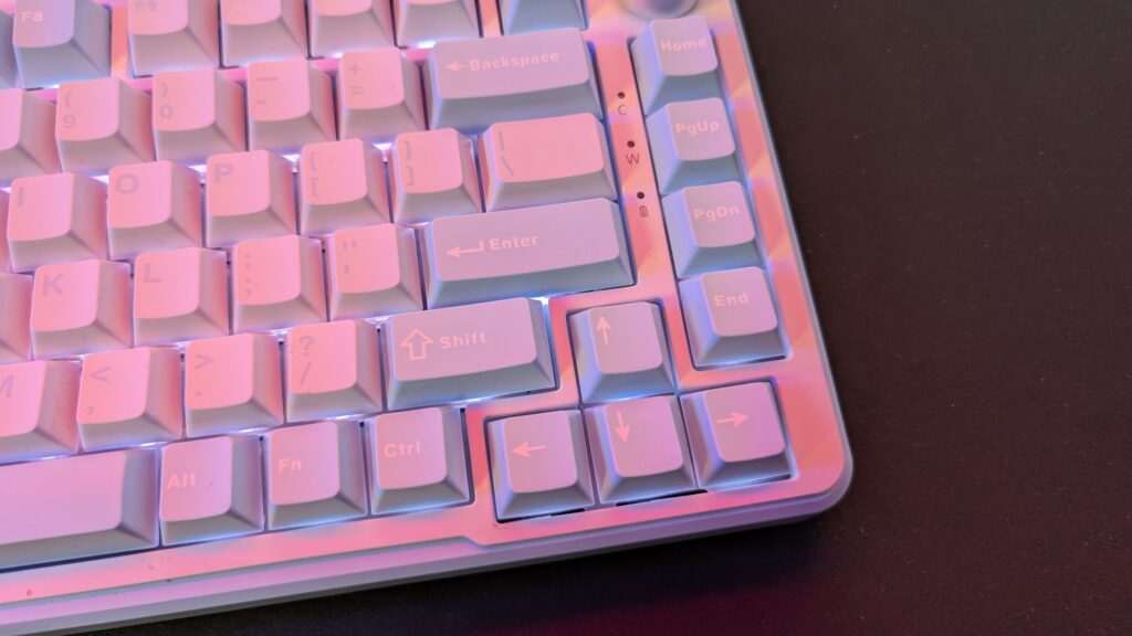 Both keyboards use cherry profile double shot keycaps – no surprise there because every mechanical keyboard seems to use them now. But in both cases, they look good and feel very nice to the touch. Both are 75% layouts so you retain your F keys, some function keys down the right, and both have a rotary knob in the top right for media functions, mainly volume and mute control, but in either case both are very similar though incremental movement on the GS75 is a lot firmer. Moving inside of both keyboards, this is probably where you’re going to see the biggest difference because audio profiles between the two are pretty different, just take a listen to this.