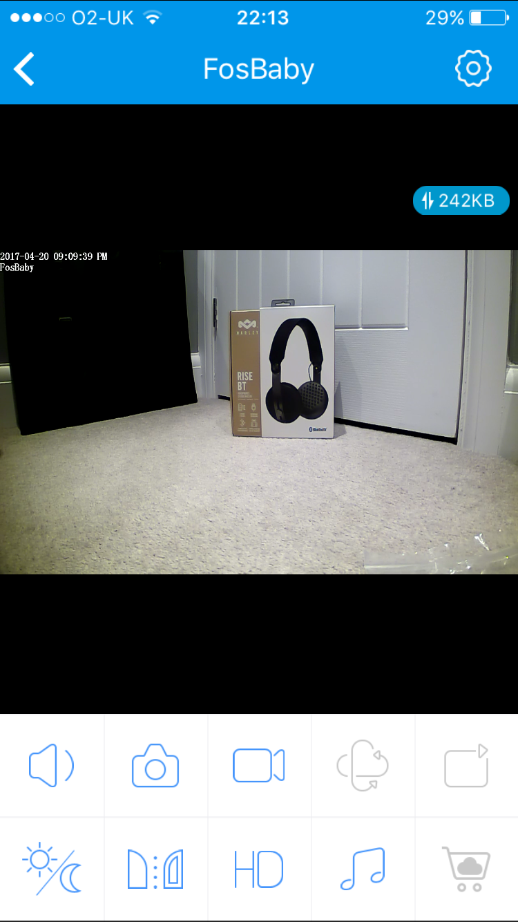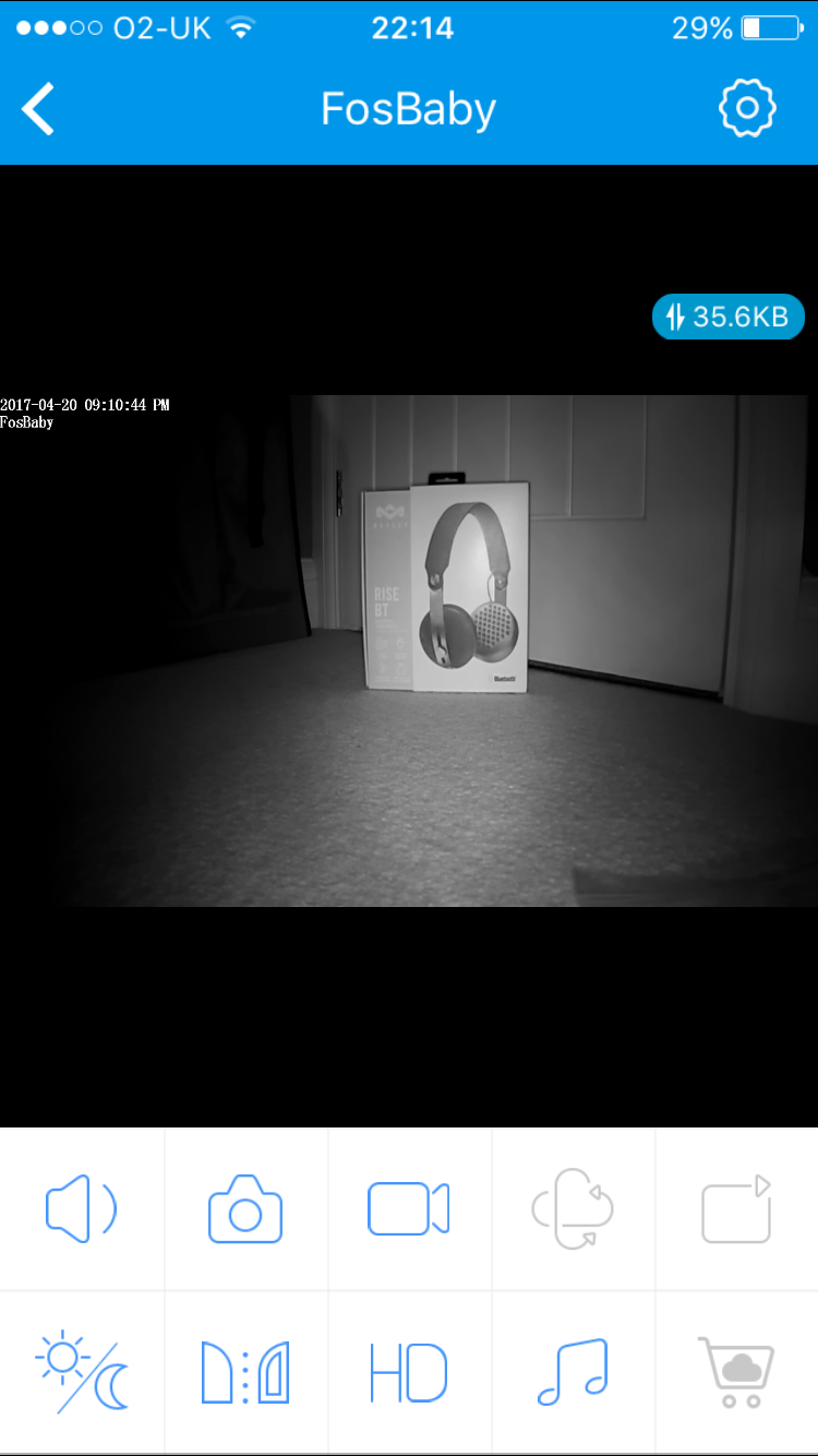 When you open the app for the first time, you will need to create a general FosCam account, which enables you to log into the app and your cameras. You will need to add the camera to the app, which is very easy and includes instructions on screen but in essence, scan the QR code on the camera upon request and the app does the rest. You can have multiple cameras under one account and control them all individually. On screen options include ‘listen & talk’, take a photo, record video, adjust day/night mode, adjust image rotation, select image quality and play nursery rhymes.