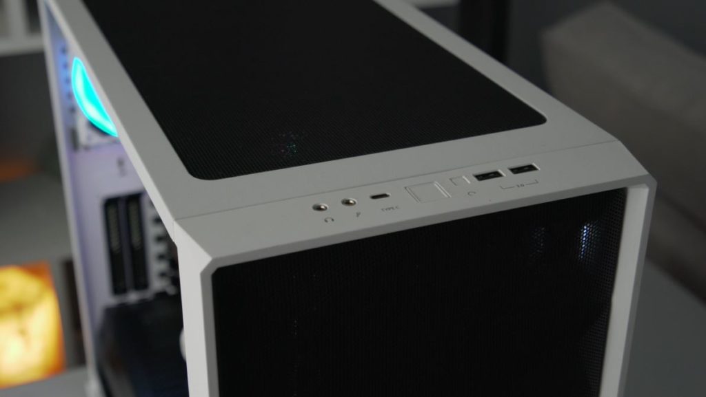 The tempered glass side and back cover ‘snap’ on and off our white bodied case with black interior, but there are thumb screws to really secure it, which we found we needed on the back, especially as we introduced custom sleeved white cables into the build. The space for cable management isn’t the best for such a chunky case, but there are some velcro straps that you can use to tighen your cables to the case itself and keep them as flush as possible. The pass-through grommets are rubber and subtle – smaller pass-through holes are just that, no rubber protection, but that’s fine. But once we were using several SATA connections for the Corsair RGB node, several hard drives, and even the gross ketchup and mustard 24-pin motherboard cable, space became a little sparce.
