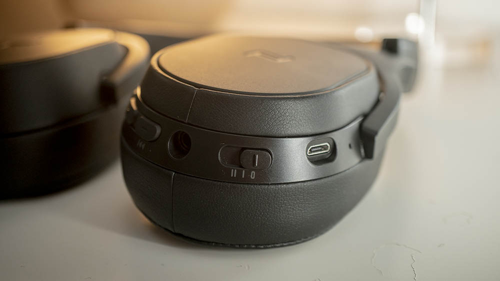 The entire IO is placed on the right earcup. Here you can find two ports for your 3.5mm aux cable and your microUSB charging port. There are three buttons placed together for play/pause and volume and a seperate slider to power the headphones on and turn on the ANC. The first click enables power and use with a wire, while the second click turns on Bluetooth and ANC together. There’s no mixing and matching unfortunately, although the cable works in the Bluetooth/ANC mode, but the battery will likely die faster due to the unused Bluetooth signal being sent out of the headphones.