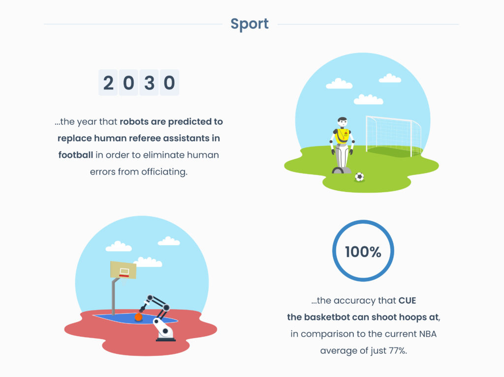 The annual RoboCup competition features football-playing bots powered by artificial intelligence. While the technology is fairly primitive at this stage, organisers aim to field a robot team capable of beating the human World Cup winners by 2050. It remains to be seen whether a team of androids can overcome the tiki-taka tactics of Spain or the flair and finesse of Brazil, but in basketball, robotics are a little more advanced. Forget LeBron James, CUE the ‘basketbot’ can shoot hoops at 100% accuracy. The current NBA average is just 77%.