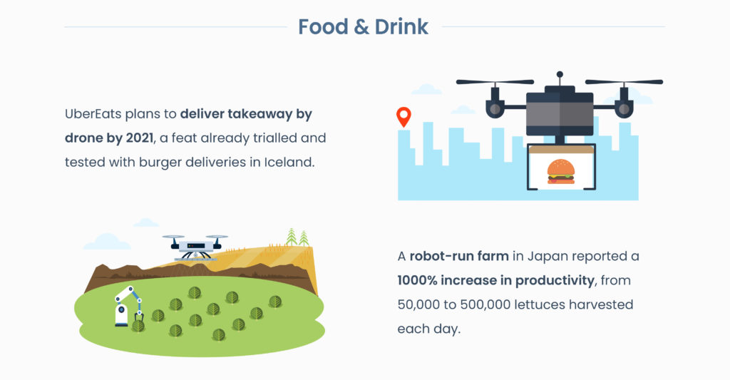 But flying burgers and delivery drones you don’t have to tip aren’t the only way that the machines are taking over the world of food and drink. The market for robotics in the food and beverage sector, for example, is predicted to be worth $2.5 billion by 2022, with one study giving the industry an automation potential of 87%. This means only 13% of food and drink jobs couldn’t be completed by a robot.