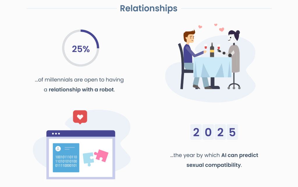 But for some, humans just don’t do it for them anymore. An increasing number of people are in favour of letting machines be involved in other, more intimate, aspects of their romantic lives. Havas surveyed more than 12,000 people from 32 countries and found that 25% of millennials would be open to having a relationship with a robot, believing it will be normal for humans to develop feelings for a robot and even fall in love. David Levy, the author of a book on the love between humans and robots, has even predicted that robot marriages will be legal by 2050.