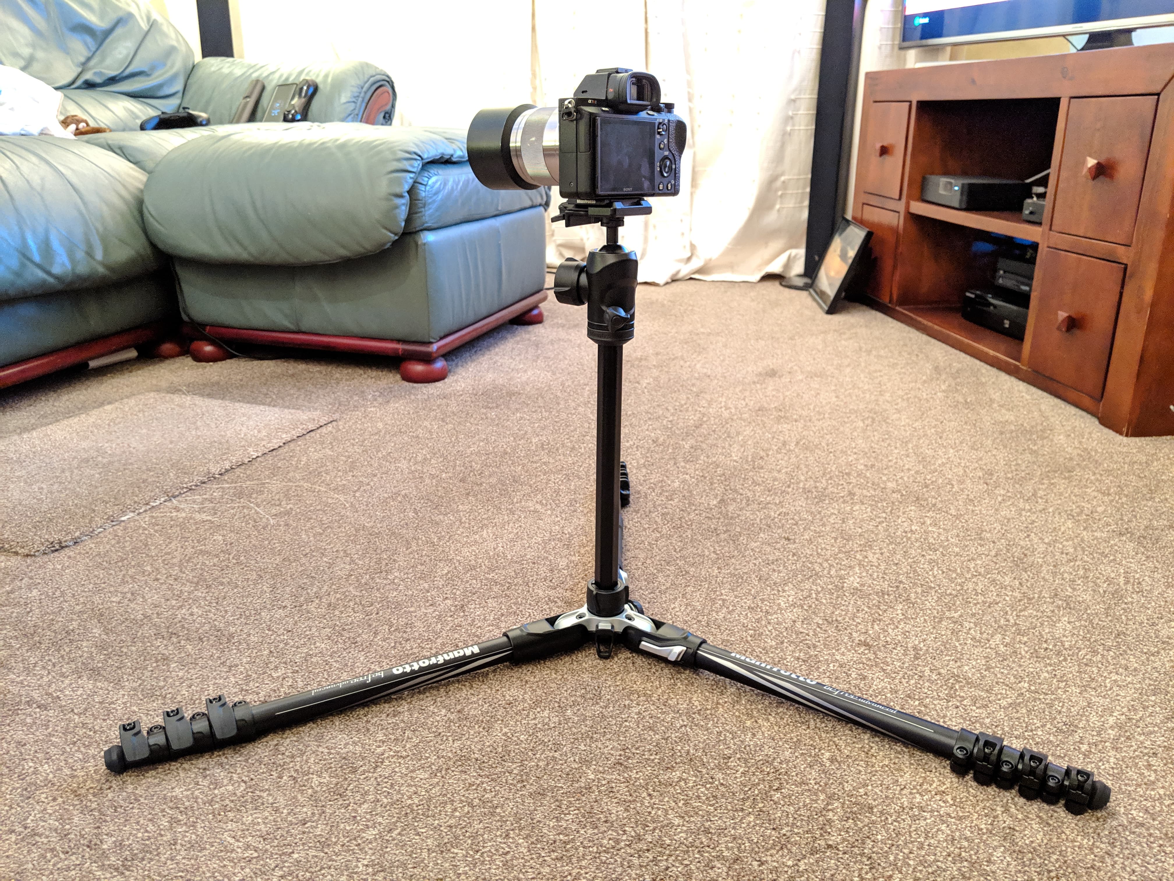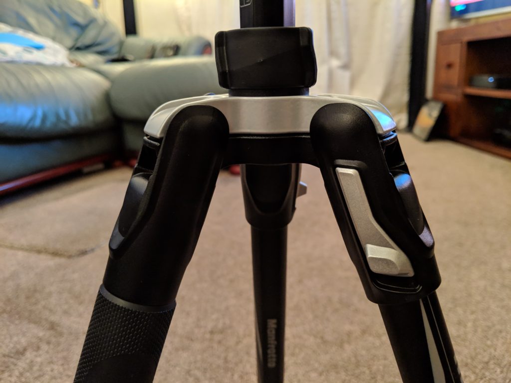 The legs open into three stages. While closed the tripod’s length is around 40cm. When opened though, your tripod will stand at roughly 1.5 meters. There’s also a height adjustable arm leading from the legs to where the camera sits on top. Where the legs meet is something that Manfrotto are calling the Easy Link, which is essentially a 3.8″ screw hole for photography accessories.