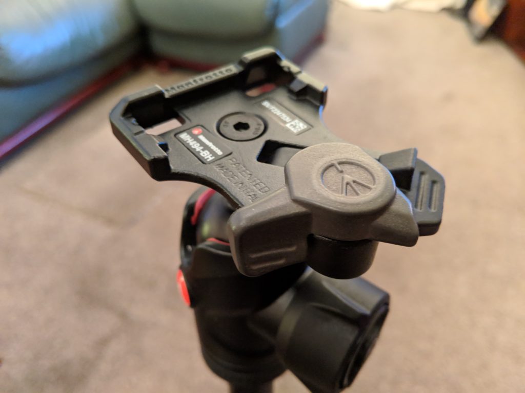 On top is Manfrotto’s 494 Ball Head which is insanely smooth. If you’re on uneven terrain, then the ball head really comes in useful to level out your shot. No spirit level is present though which I found a little strange for their products, so I had to rely on my camera’s internal level. Not a big deal though. The camera plate secures to the head with two mechanisms. The first rotates, fixing a lip of the plate in place, while the second mechanism holds the first one in place. It saves you from accidentally swiping the first mechanism as everything locks.