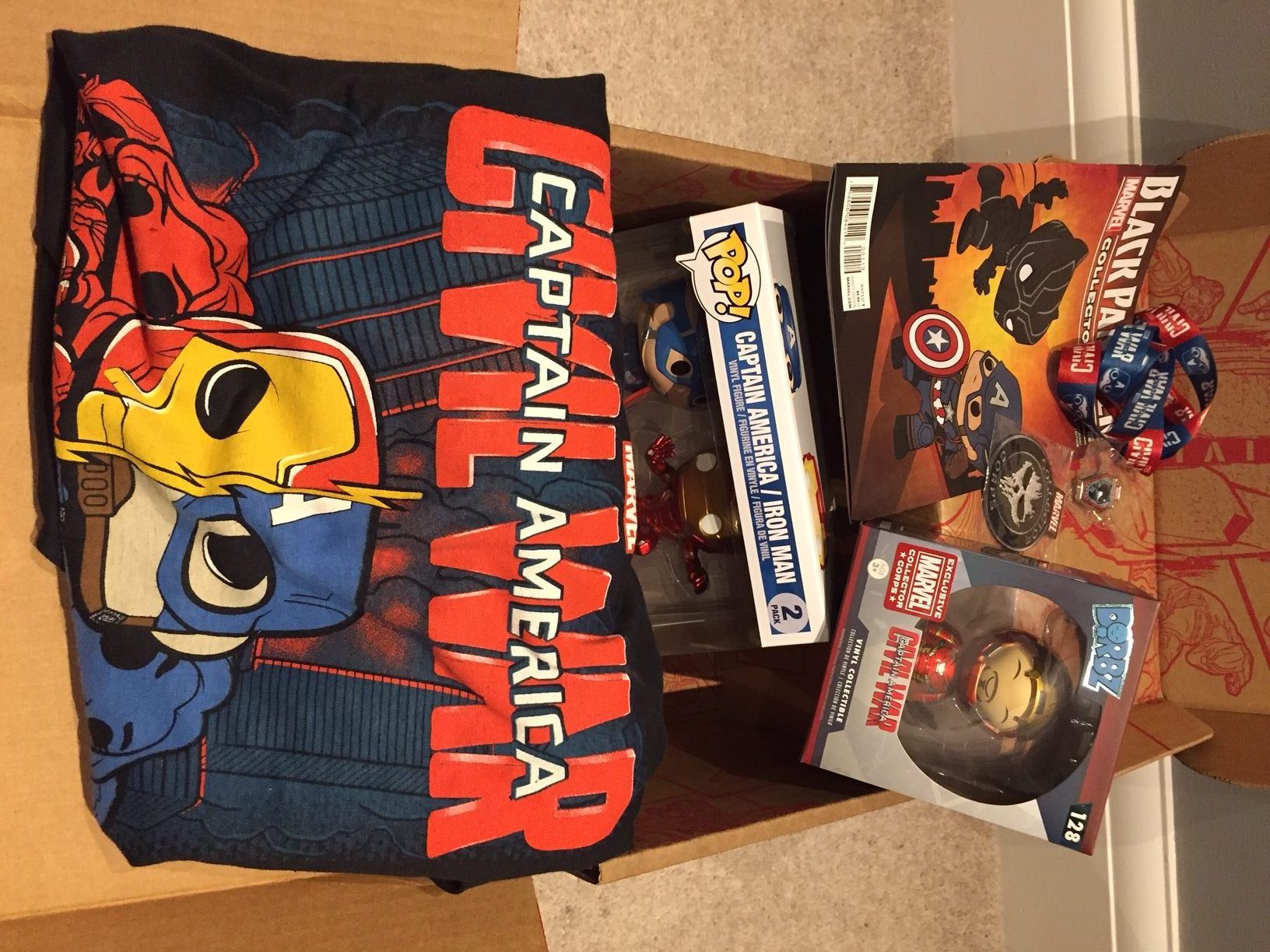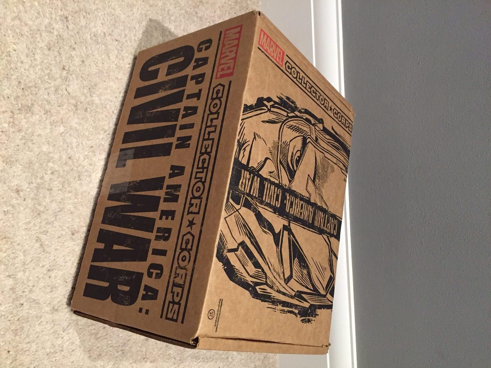 The latest instalment from the subscription box is named ‘Civil War’ and is based around the latest Captain America movie ironically named Civil War! I’ve had subscription boxes before, but not this one specifically. I am a fan of Marvel and comic books in general so let’s see what’s inside. I should add this is a two monthly subscription box and is purchased via a US website. Prices once converted come to around £33 including delivery and customs.