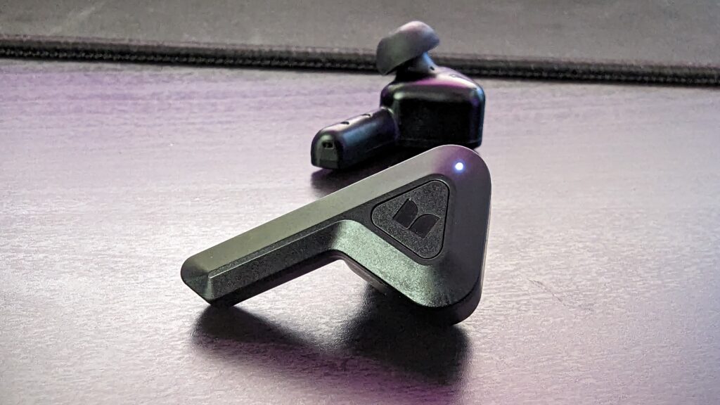 Taking a look at the headphones themselves, they come in a nice small triangle charging case that’s small enough to fit in a pocket to carry around with. The door of the has a nice solid spring-loaded action which feels tough and it has magnets for when it’s closed. The headphones also stay in place with magnets for a secure fit. It has a max battery life of around 24 hours while the headphones last for around seven hours of listening time which I must say is pretty decent. It also features Qi-charging so if you have some form of wireless charging pad in your home or office, you can opt to charge your headphones this way too.