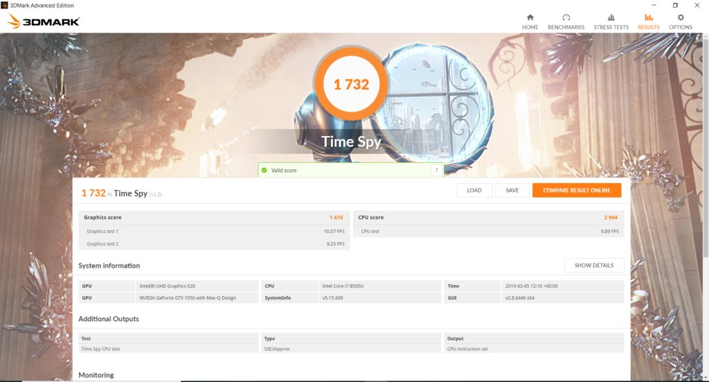 If you’re anything like me, then every time you see an nVidia logo on a laptop, you automatically think what sort of games can it play. Well let me be a little critical here. Yes, this laptop can play games, even AAA games, but it doesn’t play them as you would expect a high end desktop to play them. You’re generally restricted to low to medium graphics presets to give you a playable framerate. Shadow Of The Tomb Raider for example when using the medium preset gave us an average FPS score of 26. Metro: Exodus gave us an average framerate of 21 on its medium preset but 40fps on its low preset. Assassin’s Creed Odyssey gave us an average of 34fps on medium preset settings and Anthem threw back framerates that ranged between 25 – 30fps depending on the environment you were in. And yes, Apex Legends ran very well on low to medium settings. I was getting between 40-50 fps, and I had a little bit of anisotropic filtering on and my anti-aliasing set to TSAA. I had to install MSI Afterburner to measure the FPS and temperatures, which as I mentioned earlier got very hot. The highest temperature hit was 94° from my CPU during a cutscene in Anthem. You can also see the various 3DMark tests we ran and their scores below.