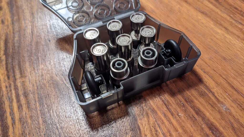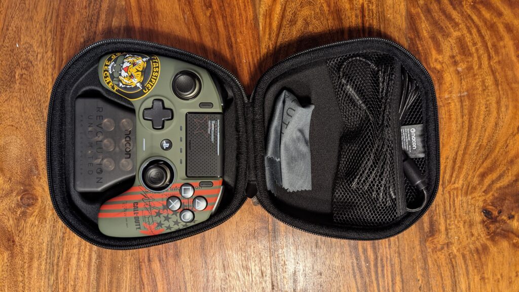 So, these added extras that you get in the box to customise your controller. You get a set of weights that range from 20g through to 32g, and the small dunbell shape weights fit nice and snug into the handles. There are also two more thumbsticks in the box, which are convex in shape. I must admit that I do prefer the concave style that come already attached to the Nacon controller. You also get a generous three metre braided USB Type-C cable to be able to plug it into your PS4 or PC. And lastly, a decent hard shelled carry case that is covered in a camo pattern which again, matches the Call of Duty aesthetic they’re going for in this special edition.