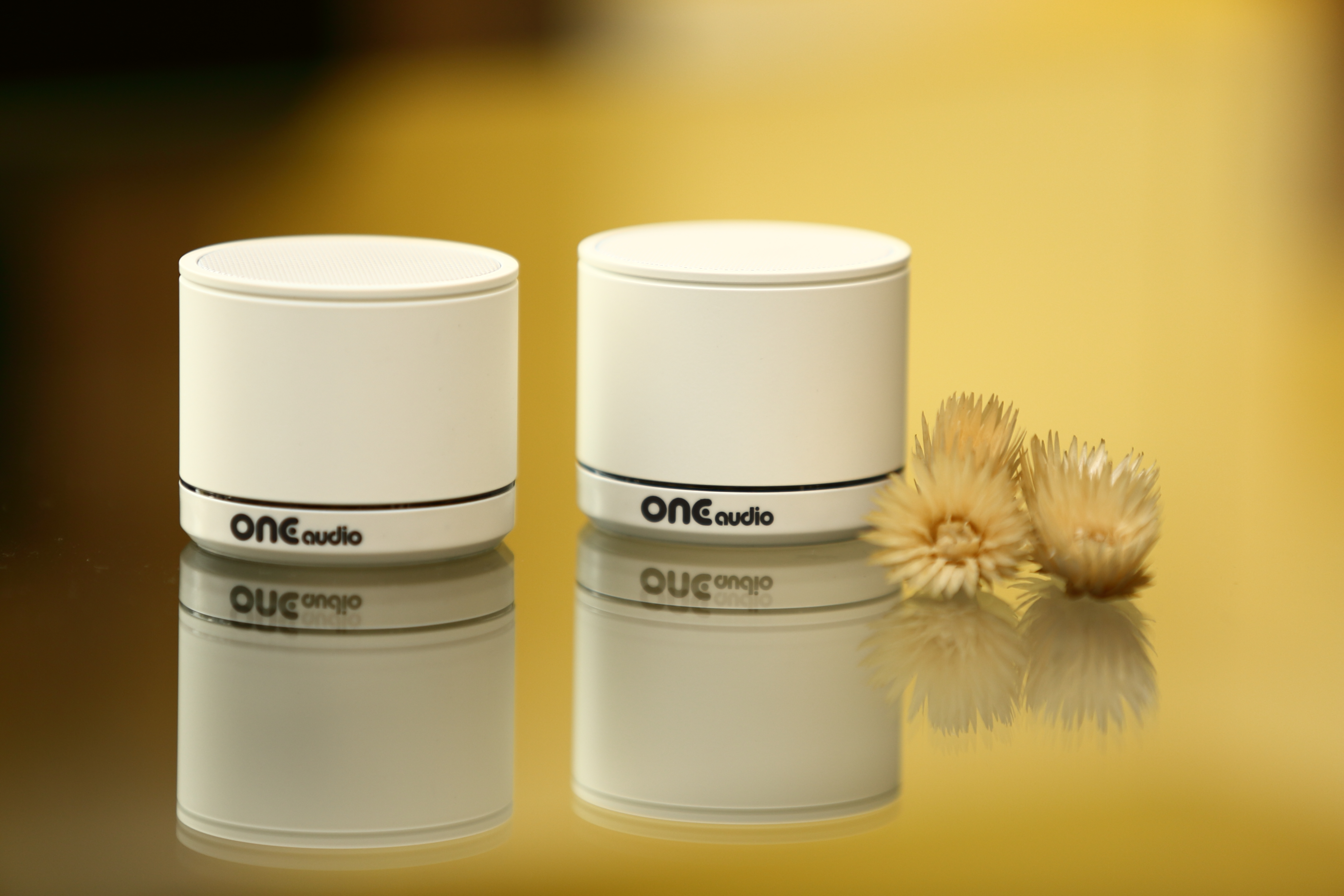 ONEAudio has done a fantastic job of making these speakers as small as possible while still retaining a decent sound quality. This is down to the materials used and the actual style of speakers they’ve opted for. Both left and right audio units are cylindrical, with the speakers in the top. This creates a more audio room filling experience rather than music being fired directly at you. The speakers are an off white creamy colour with the ONEMicro logo on the front. The bottom of the speaker is covered in  a rubbery surface giving them grip on a counter. Oh and another thing, they are pretty heavy for their size.