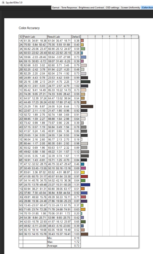 Before I go into my testing results I just want to say wow. This Philips monitor is probably the best screen we’ve had on the table ever. I mean the results achieved here were nigh-on-perfect. Not quite 100% and you’ll see but my goodness it’s come close. Anyway, enough of me fan girling over the screen, let’s talk about some results. The Colour gamuts came back strong with 100% sRGB, 95% AdobeRGB, 98% P3 and finally 93% NTCS colour gamuts. I mean already just look at those numbers. If we push into colour accuracy then again be shocked because this EVNIA screen hit an average of 0.73 on a Delta-E and a maximum of 1.72. So even that maximum Delta-E is pretty much spot on compared to some screens we’ve seen in the past.