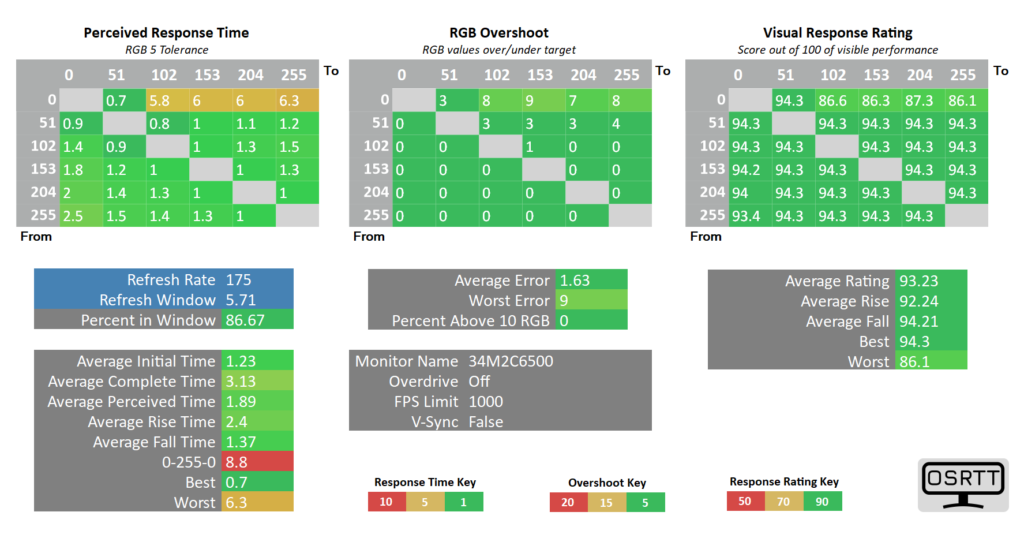 For its grey-to-grey response time, I got back a measurement using the OSRTT tool of 1.23 which I must say is pretty astounding if you ask me. This was while having Adaptive Sync and Low Input Lag both switched on. This was also equally as impressive, as the refresh rate being 175Hz during the test, sat comfortably within this window at around 86% of the time on the panel I have here. In terms of RGB Overshoot, the Philips Envia panel here performed brilliantly, with an average error coming in at 1.63, but the wort error coming in at 9. If you look at the chart above it though there is really nothing going wrong here and all is looking almost perfect.