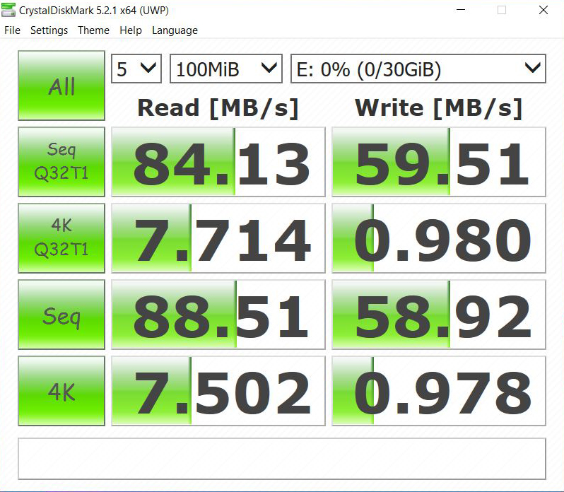 As most people now-a-days use laptops, I thought it would be more accurate to run a benchmark inside the built-in SD card slot on my XMG 502. I used CrystalDiskMark for my choice of benchmarking software.