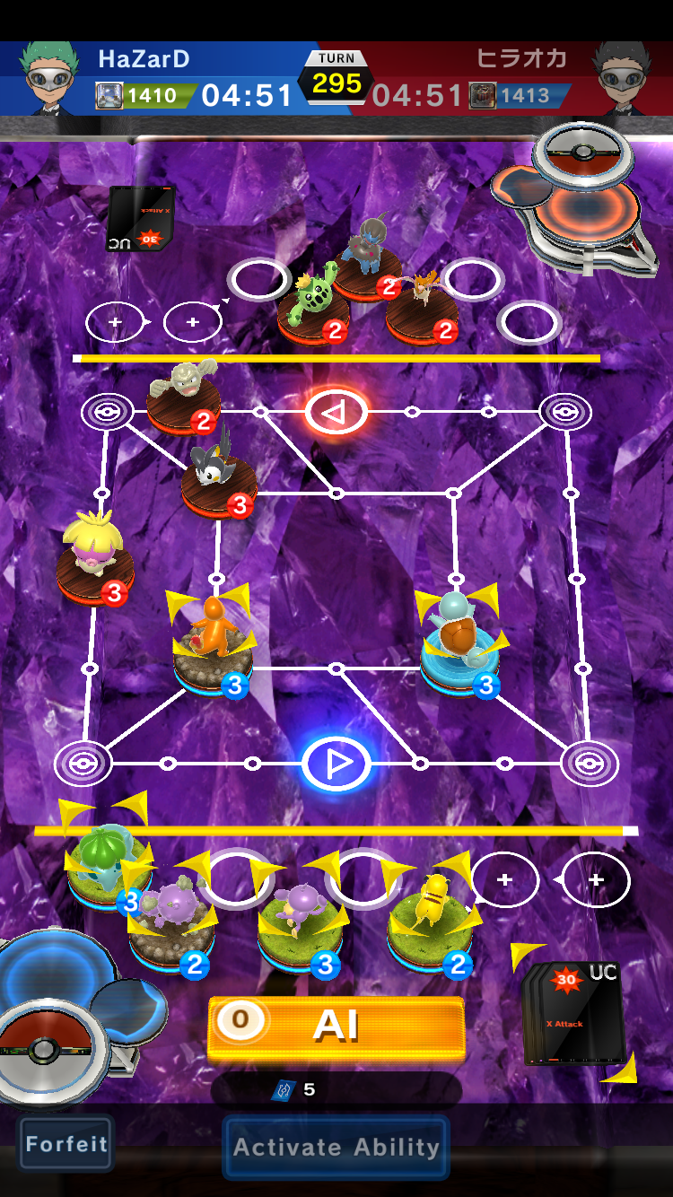 As mentioned before, there is a tutorial, which is lengthy but it is very informative and takes you through the basics. In essence, both teams have six Pokemon and the goal is to get one Pokemon from your side of the board, to your opponents side. Sounds simple but there are many differing factors that make this a very strategic game. First off, different Pokémon allow you to travel different distances, like one, two or three spaces. You then also have to consider the spaces your opponent occupies and with which Pokemon. To steal the space your opponent is occupying, you will need to battle with them and this is done with a spin of the wheel. The wheel will show different attacks and also ‘miss’. Hit stop once the wheel is spinning and hope you land a higher powered attack or disable move than your opponent. Your Charmander gets ember (30 atk) and your opponent gets a miss, you knock their Pokemon out and they go into a graveyard of sorts. A maximum of two Pokemon can be in the graveyard at any given time so when your third goes into the graveyard, your first comes back into play. There are other factors to consider but I’ll let you figure those out as you play!
