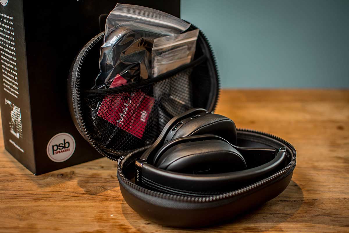 The headphones arrived in a well presented, large box and once opened, I was greeted by a PSB logo’ed hard case. Open the hard case, and there are the headphones. The headphones are predominantly black in colour, with a black leather feel/white stitching, padded metal headband, a hint of chrome. The headband is adjustable, each ear can fold away and tilts, for added flexibility. There is a premium feel to the headphones, given how they are presented, the included carry case and their retail price, but they don’t look that premium to me. They are well constructed but compared to the likes of Bose or B&O, they look a little dated and clunky. If the performance is good, I’m less concerned about how they look. Also included in the box is a 3.5mm cable, micro USB cable, 1/4″ & flight adapter (old school!), replacement ear cushions and cloth.