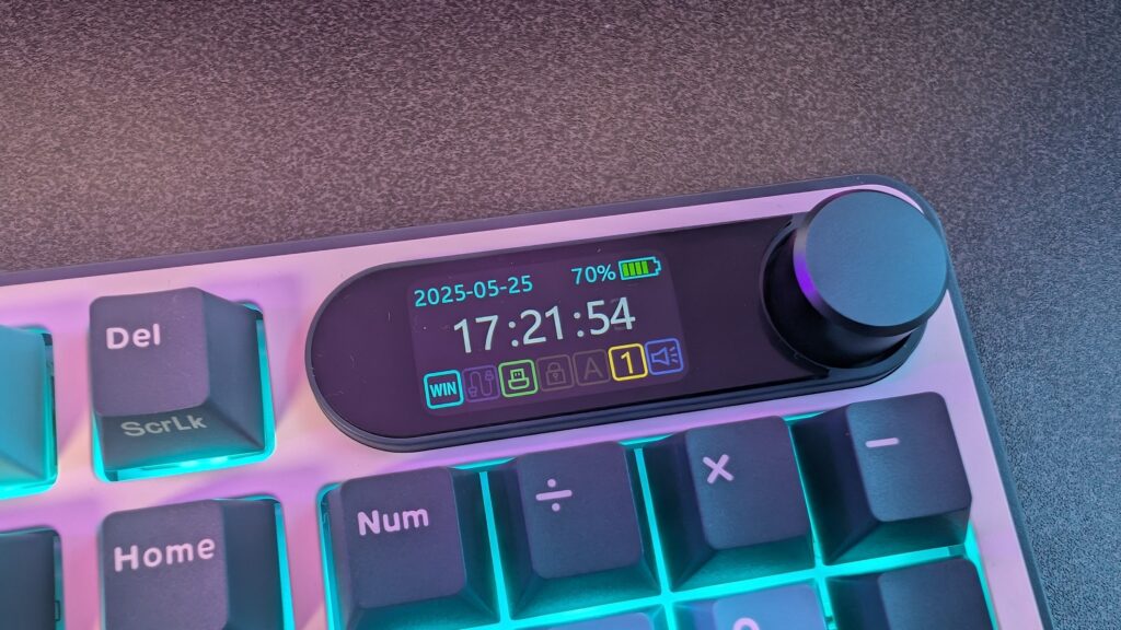 The Royal Kludge RK-S98 is a 96% keyboard which I do find quite funny, because the thing that’s really been reduced from a full-sized keyboard is the function cluser, and the keys have been doubled up. So for example, Delete and Scroll Lock share a key, and Page Up and Page Down share keys with Pause and End. However, why Home and End didn’t share the same key is baffling, that makes most sense. But anyway, yeah, it’s a chunky gaming keyboard that retains its number pad, and has also included a screen on the top right hand side that’s controlled using the knob. Twist it and you get your volume controls, but press it, and you enter the menu where you can manually change the keyboard’s connection type from Bluetooth to wired to 2.4GHz, and the RGB effects and brightness, that kind of thing. The knob is very secure in its slot and there’s no wobble, and it’s a very simple menu you get. Though in no way does it replace its own software, which we’ll talk about in a moment, and the best part is you can put your own GIF on there if you wanted to really customise your experience.