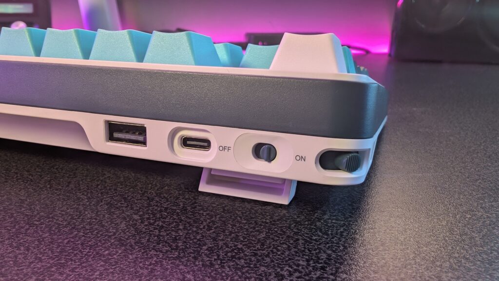 Mine here looks to be using the pale green switches, though on the website, there’s an option for Linear Viridian switches as at the time of writing the Pale Greens aren’t available or they’re out of stock, so I do apologise about that, and unfortunately I can only talk about the switches I have here. However, please note that they’re all hotswappable with three or five pin switches, so if the Viridians aren’t for you then there’s the option to change. That being said, if you can get hold of the Pale Greens, then you won’t be disappointed as the typing experience here is extremely thocky and very lightweight with a gram force of around 40. They’re tactile switches so they’re nice and loud and thocky, though there if I was to say the sound profile is more of a clicky thock, it might be a closer description. You have also got several layers of dampening including poron foam, IPXE dampener pad, foam and a silicon pad in the base too. It makes for a very comfortable typing experience and also gaming experience too.