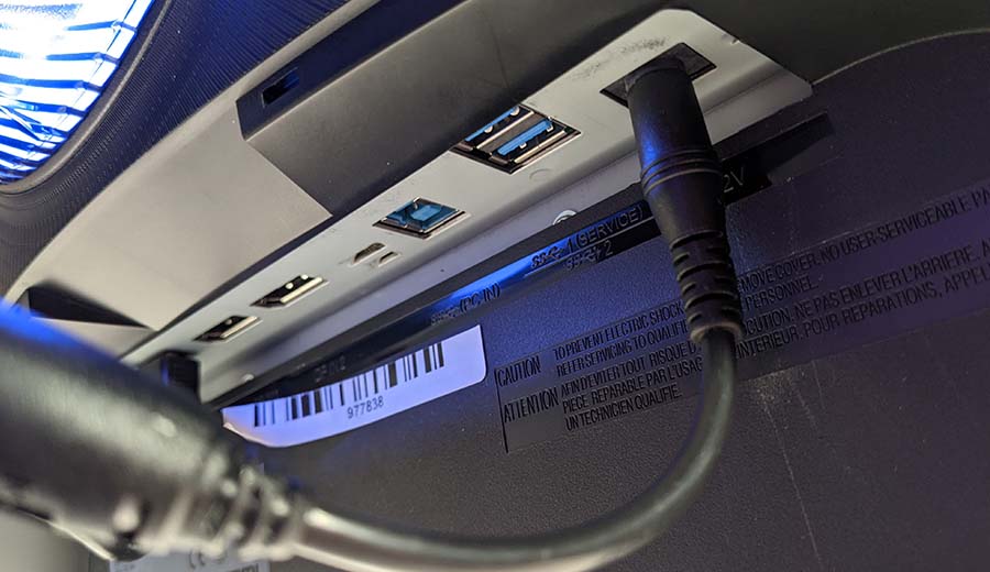 Underneath the monitor, you can find one HDMI 2.0 input (no HDMI 2.1 which is a shame here on such a high-end panel), two DisplayPort 1.4 ports, a headphone jack, power input and two USB inputs which are fed through a USB passthrough cable. So, that’s a total of eight cables coming from the back of this monitor, and there’s no way they’re all fitting into the cable run down the back of the monitor. So if you wanted to keep everything neat and tidy, you’ve got to decide which cables are essential to you. Most people I think will have a DisplayPort and HDMI cable for a PC and console so it won’t be too much of an issue, but now you know.