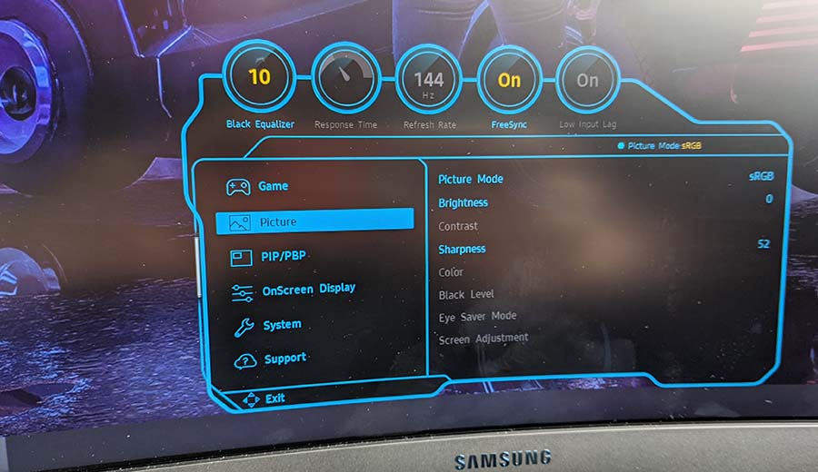 At 100% brightness, the contrast came in at 2000:1, which is a little lower than the perceived 2500:1 Samsung are claiming, but not so far off the bat like some gaming monitors fall under for advertising purposes. There is a mode attached to the monitor though, and that’s called Dynamic Brightness. Switch this off, and the contrast ratio does drop, and so does the brightness. In fact, I kept it enabled throughout the whole time testing, as after all, I am a bit of a sucker for bright vivid images, and that’s definitely what you get with the Samsung Odyssey G7 gaming monitor.