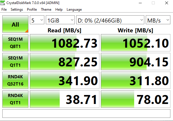 SanDisk claim that their new portable SSD can read with speeds up to 1050MB/s which is pretty quick by today’s standards. And thanks to a quick benchmark using CrystalMark, we managed to get 1082MB/s read, and 1052MB/s write speeds.