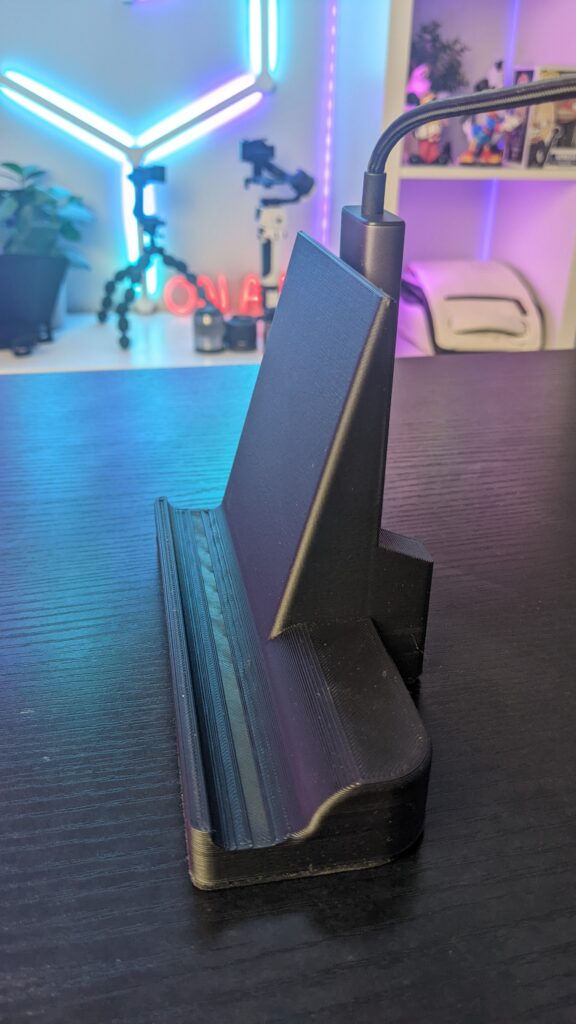 The unit itself we have here has been fully 3D printed to hold the Steam Deck, and it comes delivered as one solid unit. There’s no real assembally needed, though there is a felt material that’s supplied for the base so it’s got a bit of extra grip while sitting on your desk or side unit, and it also comes with a snappy velcro type sticky pad so you can connect your dongle to the back. I’ve positioned mine vertically, which works for me as there is still enough room for all of my USB and HDMI inputs. The whole unit just looks and feels absolutely premium, and the aesthetics are wonderful if you’re looking for something neat and tidy to sit in your desk for your Steam Deck.