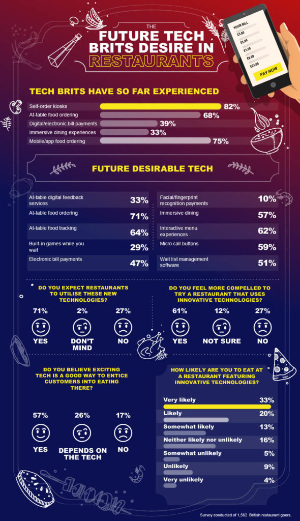 Moving further down the graphic, it starts to get a little more interesting, with 71% expecting restaurants to utilise new tech, which will put pressure on smaller businesses to obtain that technology & infrastructure. It comes as no surprise that people want in-table games to play while they wait for their food and some even want to use facial or fingerprint recognition for payments. That will be the future.