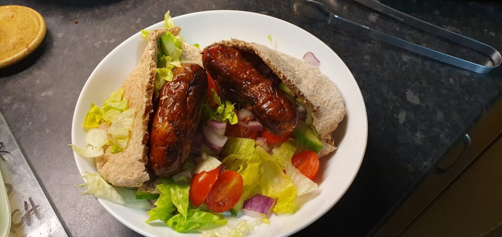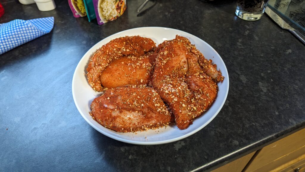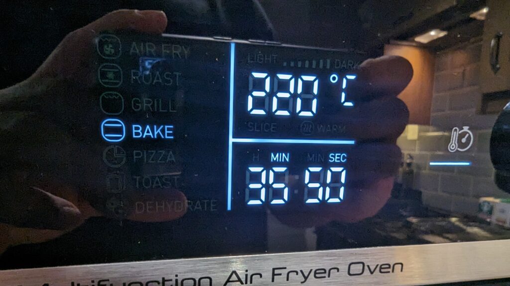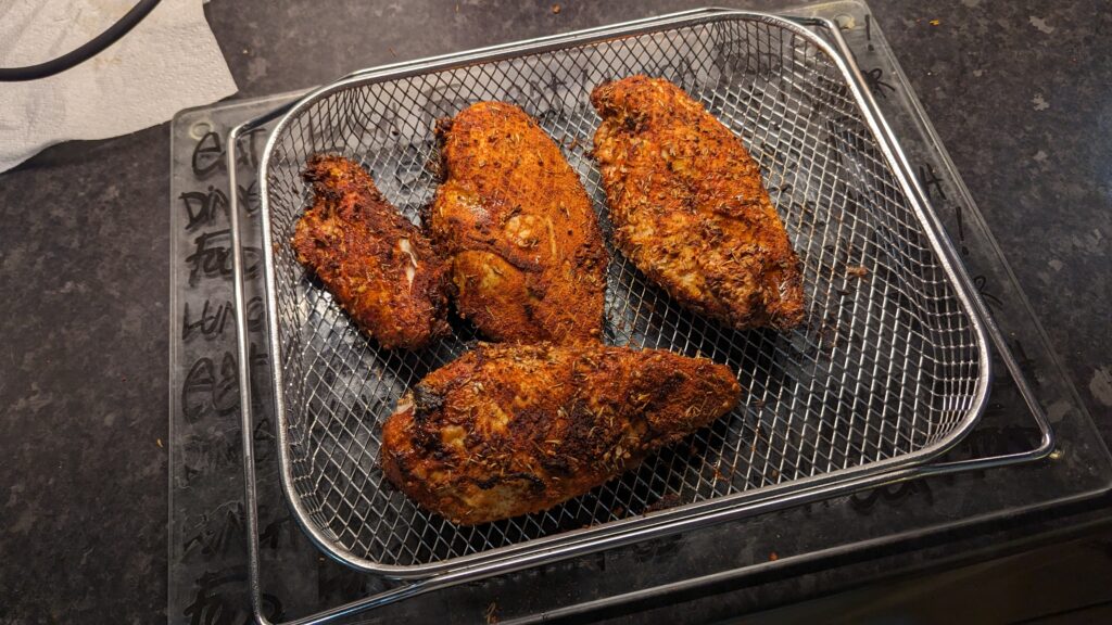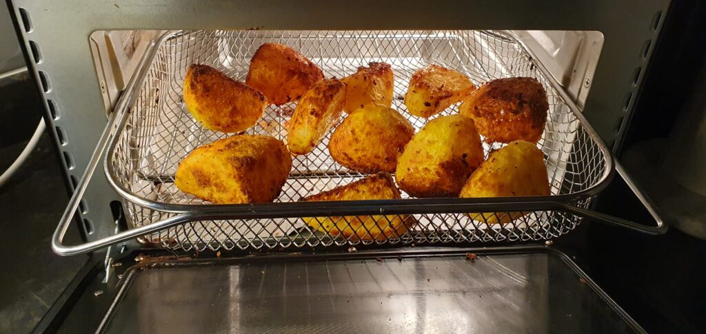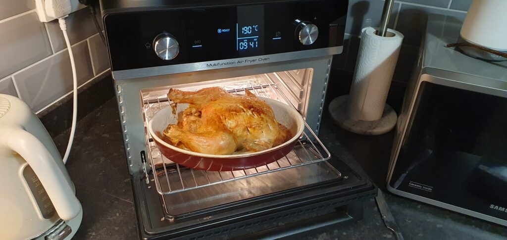 Putting it into an actual dish is also advisable to limit drips hitting the fryer’s removable drip tray. That is helpful, but we found it extra helpful to limit that happening and reduce all the possible mess. One experiment that didn’t work well was a cake, but we think that could be down to the style of cake chosen, which was all but a liquid in a tray. We are set to try a more conventional recipe. The whole chicken, followed by some roasties, has been our most challenging meal so far and it came out well – actually really well. We started it at 50 minutes but felt another 15 was needed just to be safe. No food poisoning so far so we must be doing something right. Smaller chicken breasts are a doddle as are sausages and burgers, with the occasional rotating during cook times.