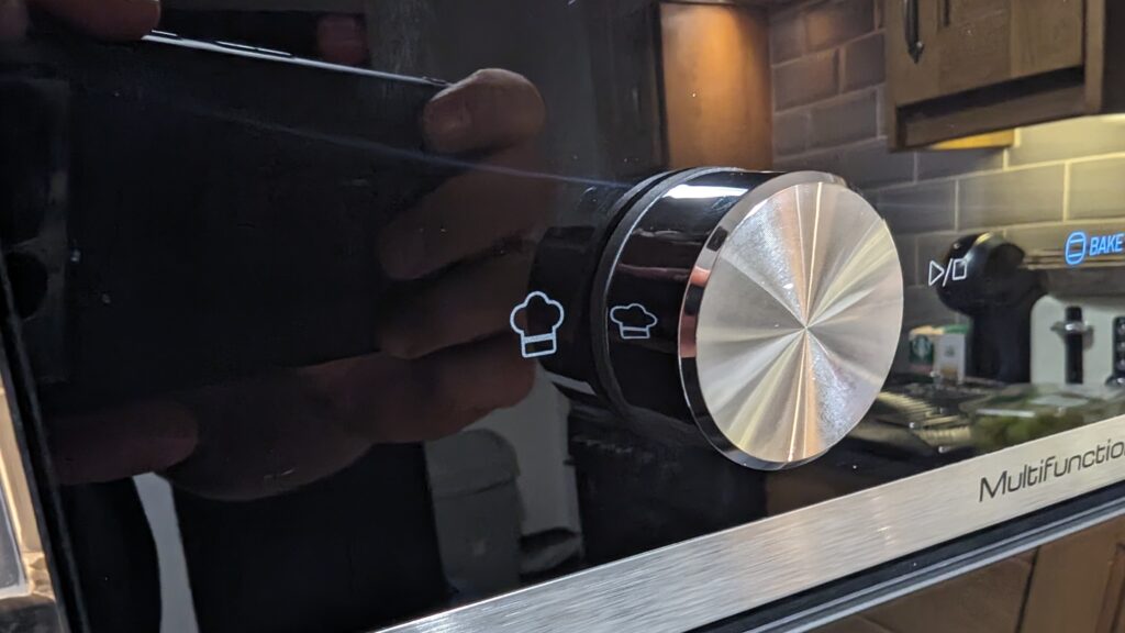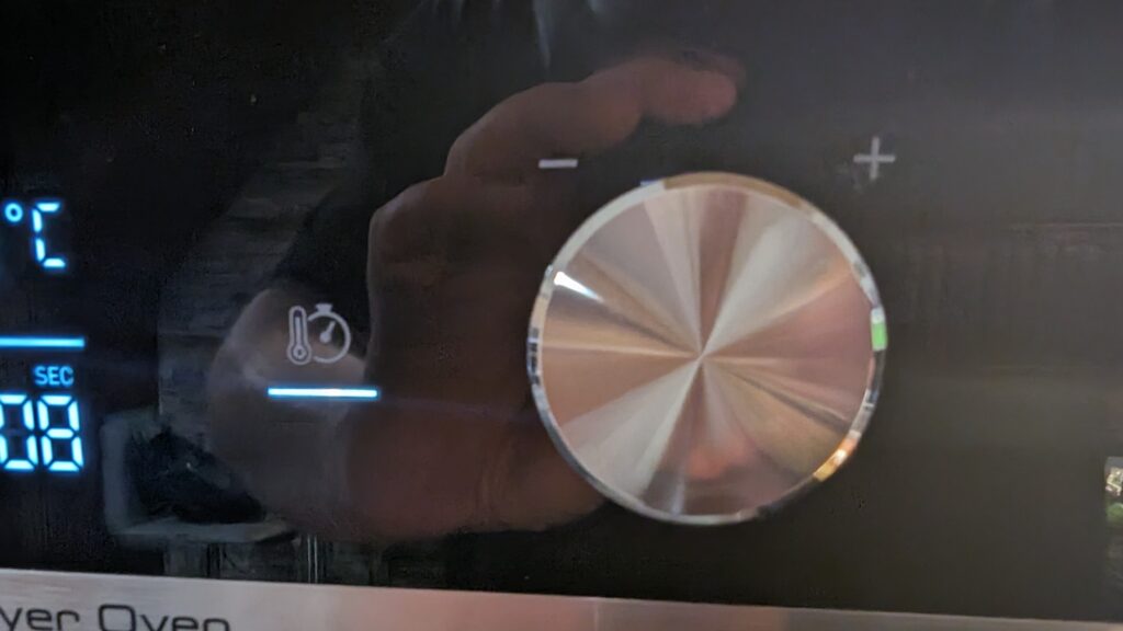 Many will argue an air fryer is greener and better for the planet and it is; but remember how much you want to cook at once and use that as a major decision maker on whether you get one or not. Let’s take a look at this Tefal. It is dead smart to look at, but is not without its faults so let’s deal with the biggest one right now, although even this is nowhere near a deal killer. It’s the door handle – when you open the single door which pivots downwards towards the kitchen top. But that handle protrudes so far, the door does not open to its full 90 degrees as a conventional oven door does. Instead, it hits the kitchen worktop at about 80 degrees. While this doesn’t stop you from putting things in and taking them out, it could possibly lead to a user maybe spilling any liquids in a low-rimmed dish because it has to be tilted at an angle. An answer is to have the unit close to the front edge of the kitchen top so the door can fully open. Or design the handle better.