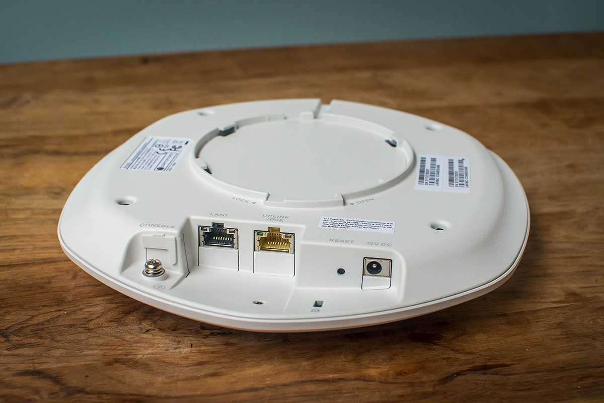 Inside the box you get the unit itself, power adapter, wall bracket and instructions. No Ethernet cable was provided, which was a surprise as you will need one of them. The unit itself is circular in shape, constructed from plastic and is about 200mm circular. Connections on the back into the power port, LAN in, LAN out and a reset button. To the front, is a single Indicator light, which goes red, blue or green, depending on what’s happening. There is a wall bracket given, as access points are typically ceiling mounted, especially in the work place. Very simple and crude bracketry, but it works just fine.
